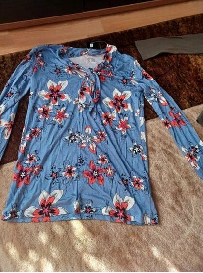 Sprzedam śliczną bluzkę damską. Bluzeczka jest nowiutka - z metką. Jest wykonana z przewiewnego, rozciągliwego materiału. Z przodu przy szyi ma lekki dekolt który jest zakończony wiązaniem.Wymiary: