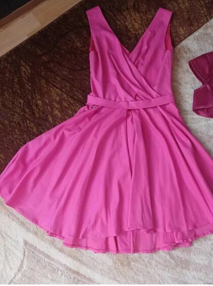 Sprzedam przepiękną, wygodną sukienkę damską na każdą okazję. Sukienka jest wykonana z przewiewnego materiału. Z przodu ma lekki dekolt w kształcie litery V (przy dekolcie jest delikatnie zszyte niteczką więc po rozcięciu dekolt w sukience trochę się powiększy). Sukienka jest w stanie bardzo dobrym.Wymiary: